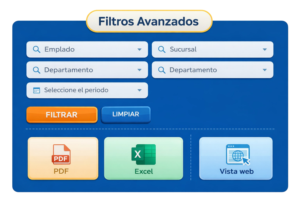 Acceda a más de 30 reportes de entradas, salidas, retardos, horas extra y ausencias