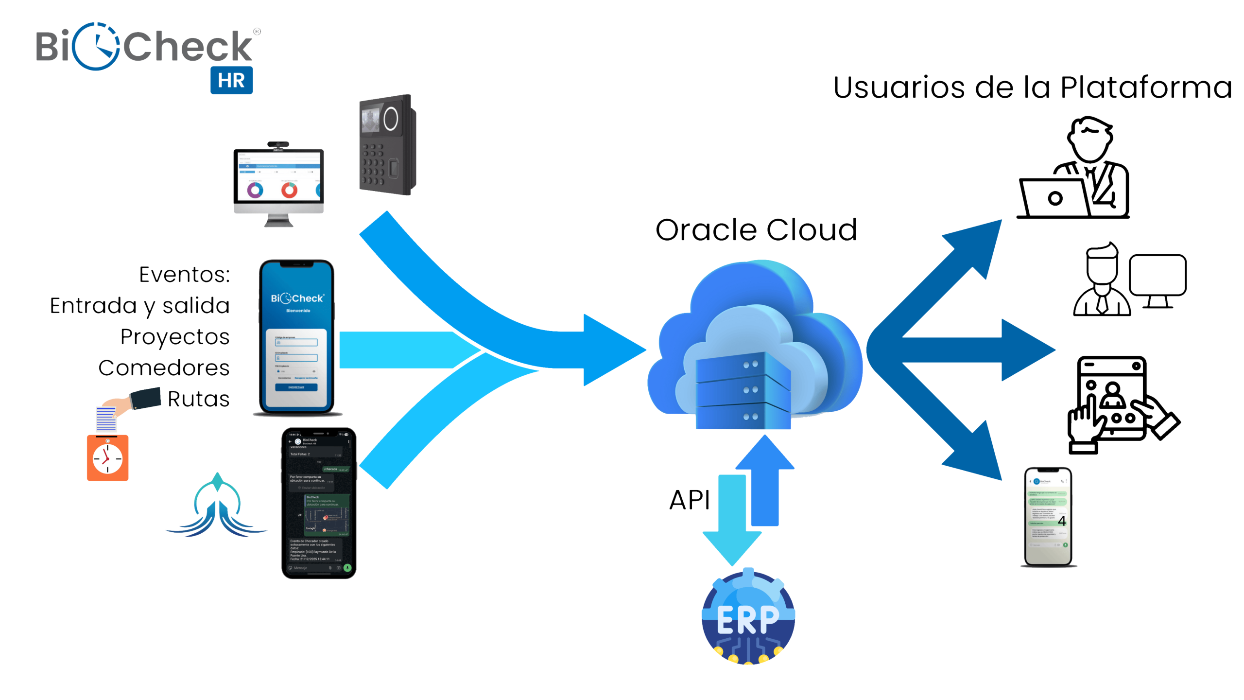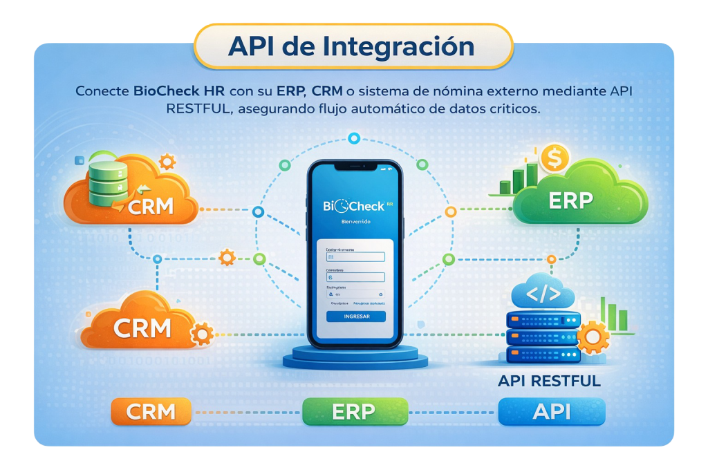 Conecte BioCheck HR con su ERP, CRM o sistema de nómina externo mediante API RESTFUL, asegurando flujo automático de datos críticos
