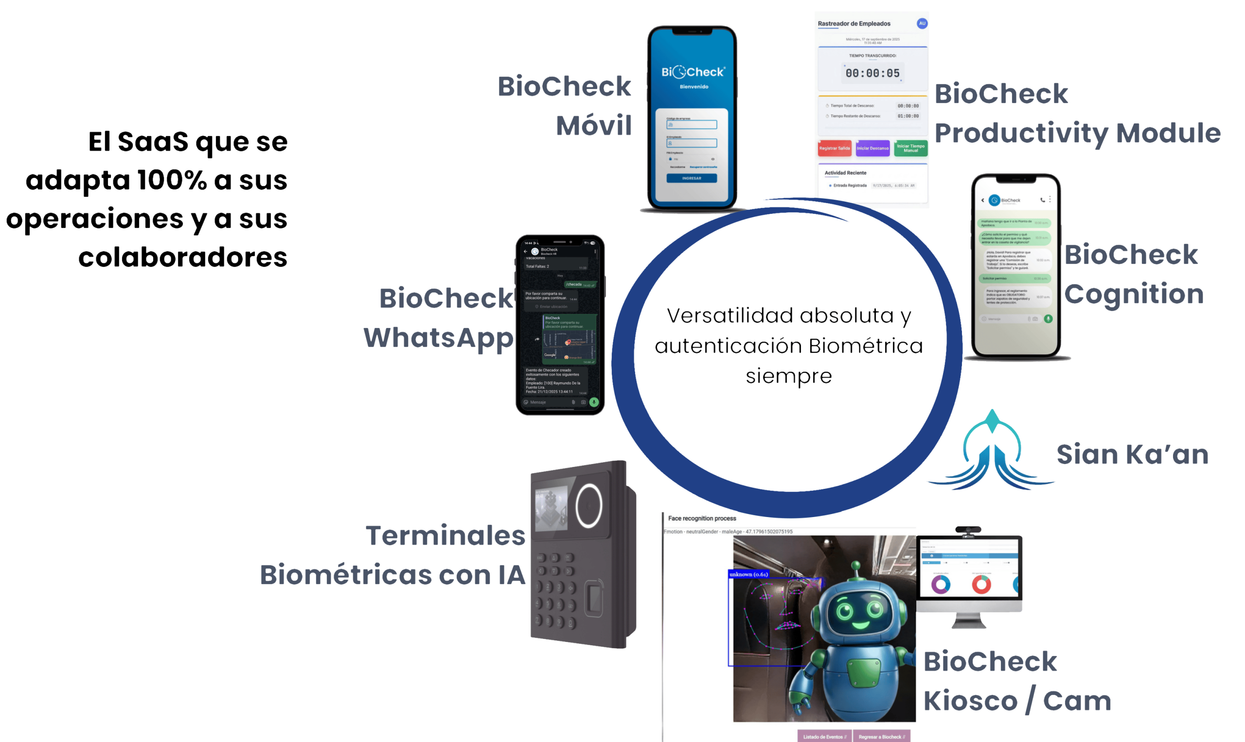 Permite el chequeo a través de la aplicación BioCheck Móvil (con geocercas y validación de ubicación), BioCheck CAM (reconocimiento facial en navegador) o terminales biométricas.